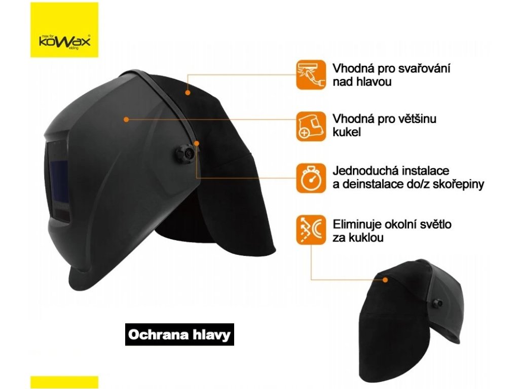Chrání hlavu, uši a krk před nebezpečným zářením, svařovacím rozstřikem a popáleninami. |